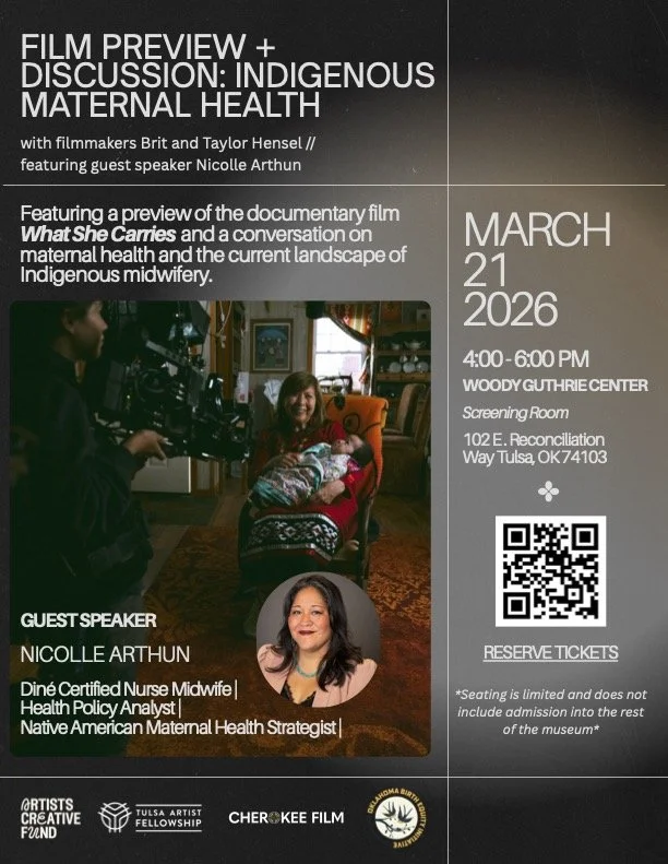 The evening will include a preview of the forthcoming feature documentary, What She Carries, directed by Brit Hensel and produced by Taylor Hensel, both award-winning filmmakers and citizens of the Cherokee Nation. The film follows Indigenous mothers, families, and birth workers as they work to restore cultural knowledge and community-centered birth practices.